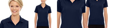 100% heathered polyester • 3.8 oz • moisture management/antimicrobial performance fabric • self-fabric collar • 100% polyester contrast shoulder panels and sleeves • double-needle bottom hem • heat seal logo on left sleeve • Sizes: XS-4XL