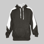 60% ring-spun cotton/40% polyester • 9.5 oz. • double-ply hood with contrast lining and flat drawcord • contrast shoulder and upper sleeve inserts • spandex-reinforced ribbed cuffs and waistband • front pouch pocket with headset opening • embroidered logo on left sleeve • Sizes: XS-4XL