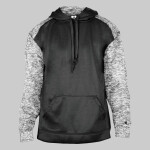 100% polyester • 7 oz. • moisture management fabric • sublimated blend shoulder panels • sleeves and hood lining • contrast stitching • self-fabric cuffs and waistband • front pouch pocket with 2 hook and loop closures at top and headset opening • embroidered logo on left sleeve • Sizes: XS-4XL
