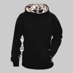 100% polyester moisture management fabric • 7 oz. • sublimated digital side and sleeve panels • front pouch with 2 hook and loop closures at top of pockets • polyester rib waistband and cuffs • Sizes: XS-XL