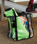 durable clear PVC • large easy-access main compartment • can carry up to 11 lbs. • stadium compliant • 4"w x 4"h approx. front panel center imprint area • 3 2/5"w x 4 1/5"h max. NFL image imprint area • Sizes: 6"w x 12"h x 12"L